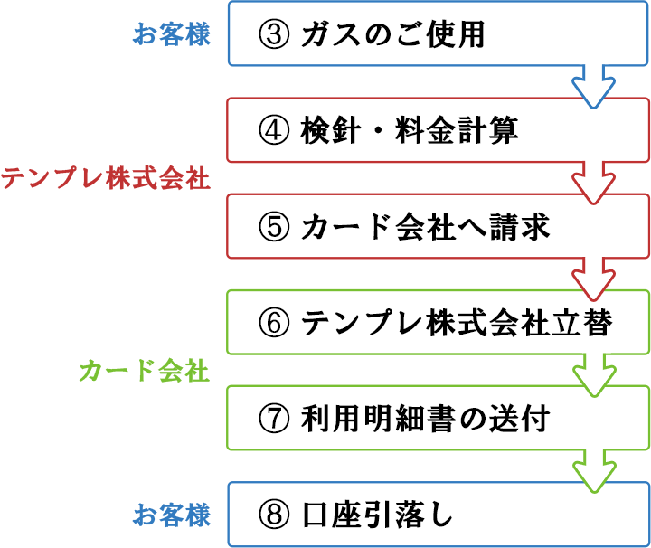 1. テンプレート株式会社にお客様からお申出がない限り、お申込みいただいたクレジットカードにより、毎月、継続してガス料金等をお支払いいただきます。