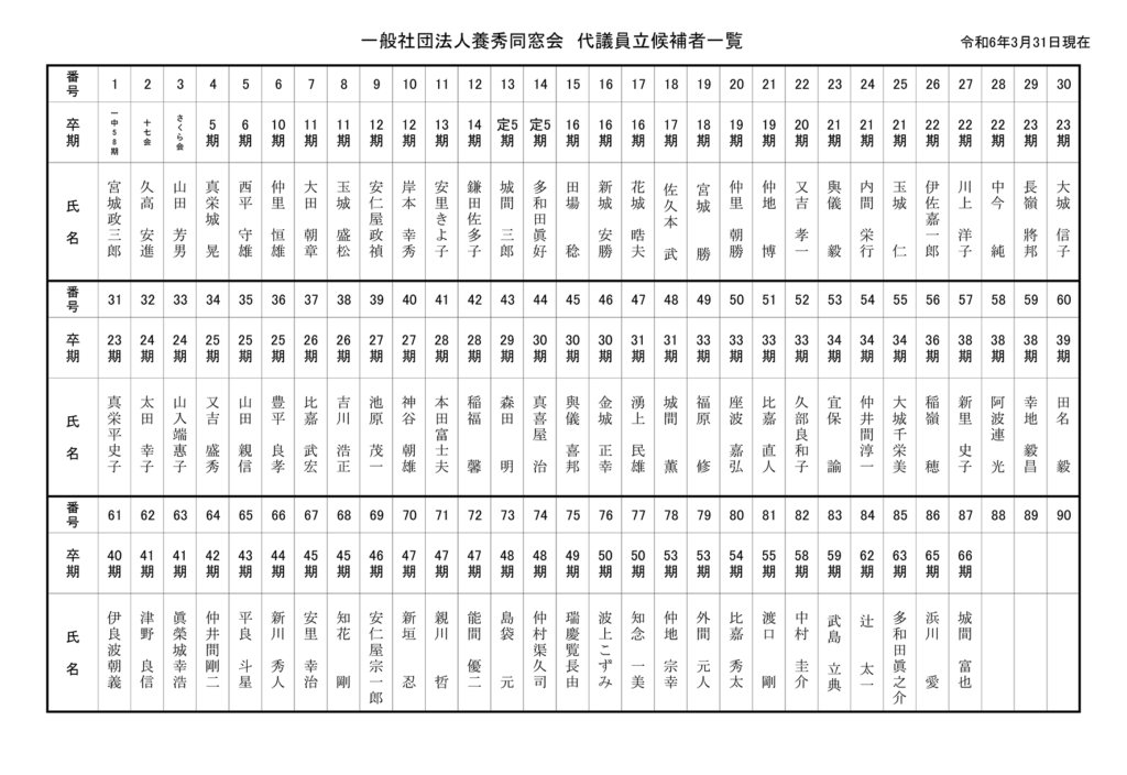 第6回 代議員立候補者について 2024 4/03 事務局より 第6回 代議員立候補者について 一般社団法人養秀同窓会選挙管理委員会委員長 外間 喜明(公印省略) 一般社団法人養秀同窓会は、令和6年3月15日に第6回代議員選挙を告示致しましたが、令和6年3月22日から令和6年3月31日の期間に、次の方々が立候補してくださいました。 代議員の発表については、4月12日(金)にあらためて発表させていただきます。 代議員立候補者一覧ダウンロード 事務局より 代議員選挙について 震天動地 No.26 2024.04.08発行 関連記事 徳田安太郎杯開催しました 2026年2月12日 古希・還暦交流試合 2026年2月12日 そめおり展開催中 2026年1月29日 劇団「Theater TEN Company」舞台公演のご案内 2026年1月16日 新年のご挨拶 2026年1月16日 年末年始休館のお知らせ 2025年12月24日 代議員選挙のお知らせ 2025年12月24日 養秀フェス2025お礼 2025年12月19日