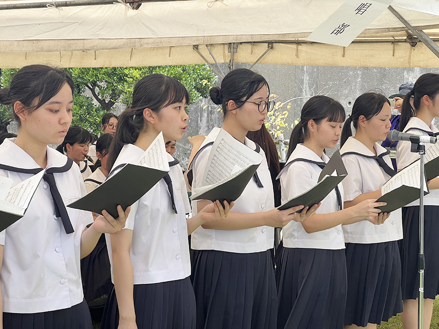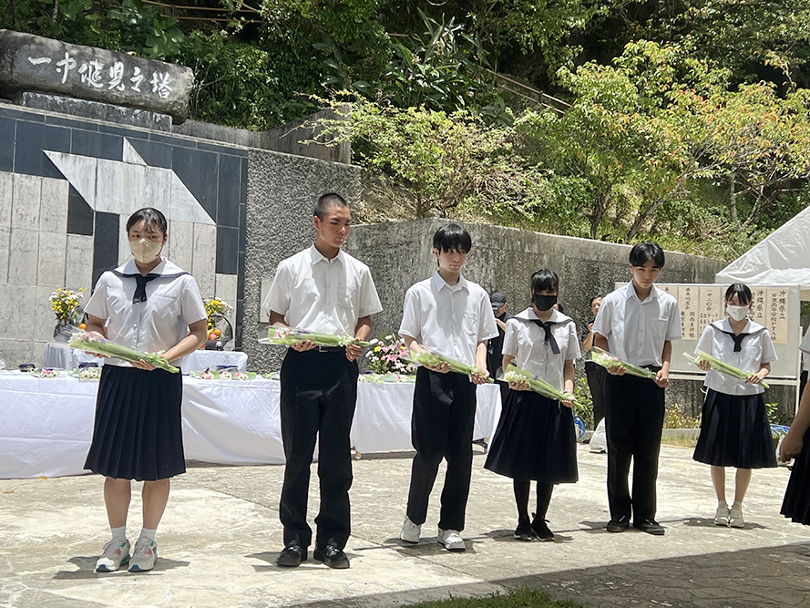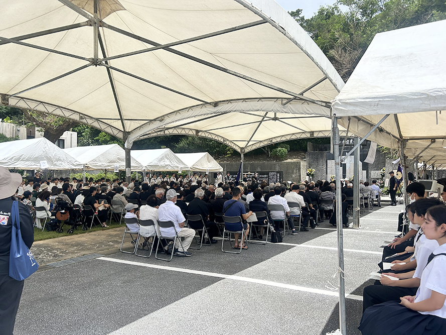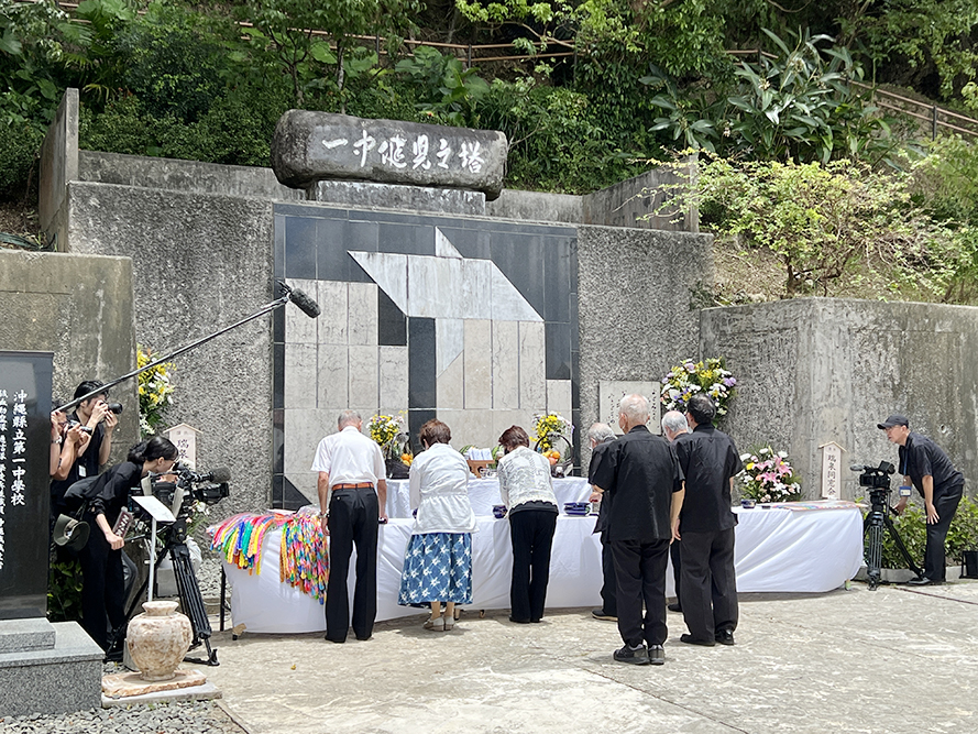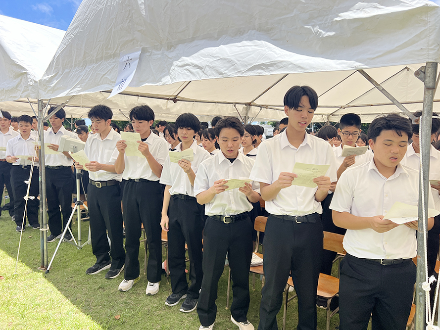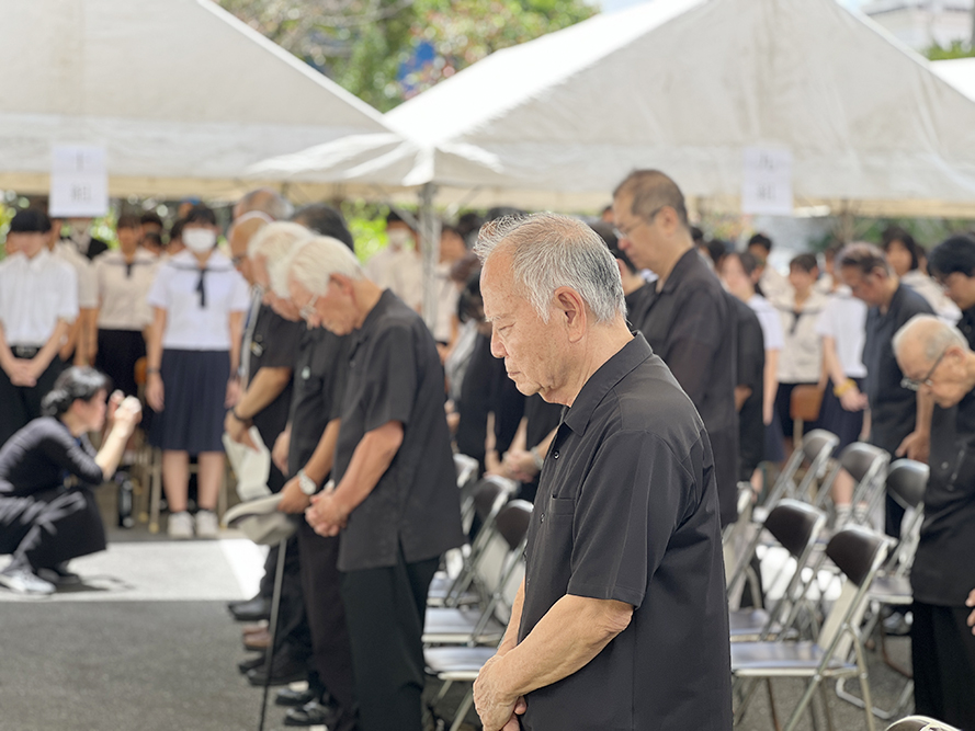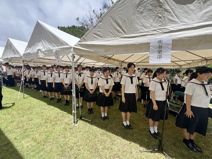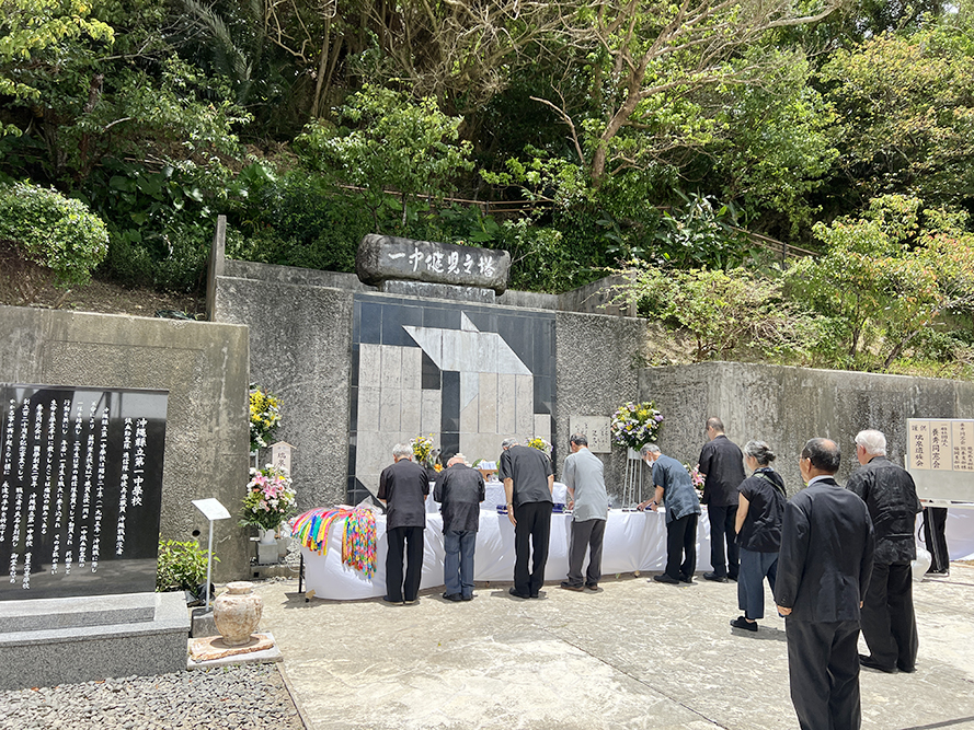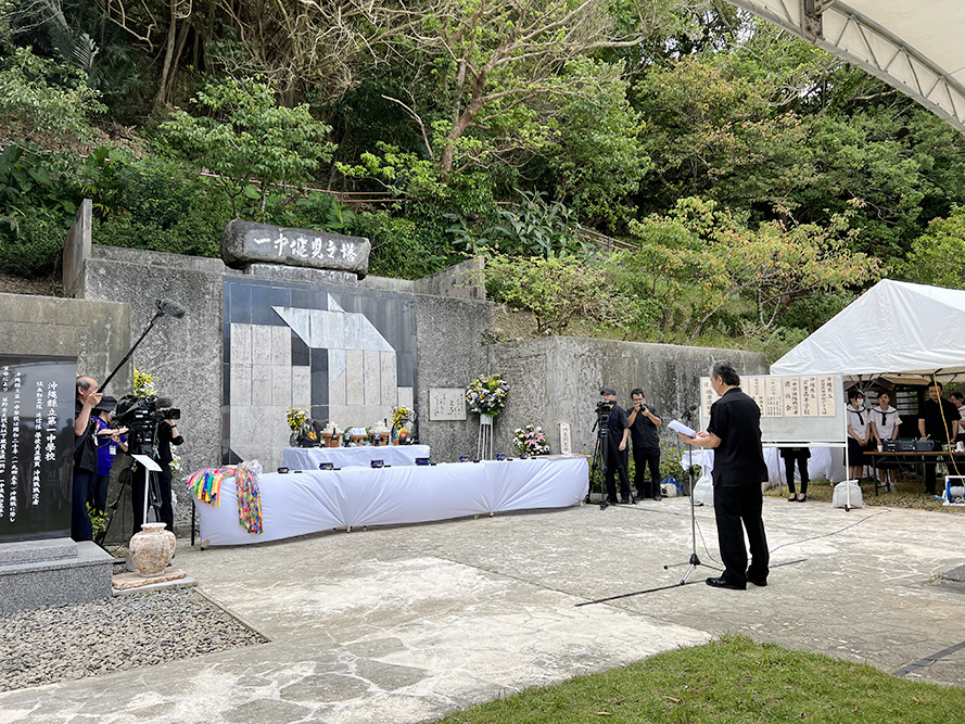 遺族や一中生、同窓生、首里高校職員・生徒・PTAなど約730名が参列し、正午の時報にあわせて黙とうをささげ平和の誓いをあらたにしました。