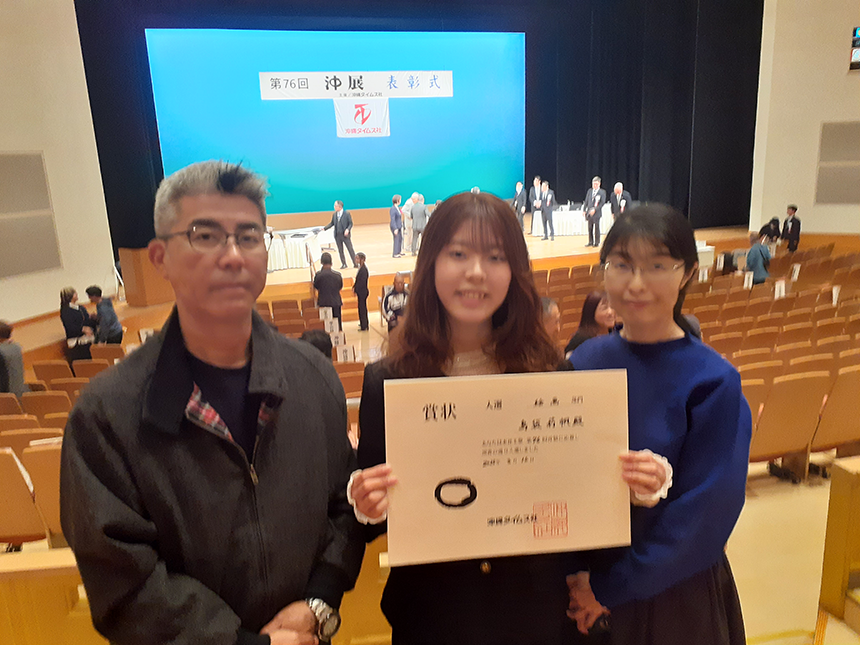 「この度沖展の絵画部門で入選し、入選者代表として表彰式に出席させていただき貴重な経験を積むことができたこと大変嬉しく思います。学びたいことを思い切り探究できる環境と、支援してくださる養秀同窓会様含め家族への感謝を忘れずにこれからも勉学に励み、精進して参ります。」