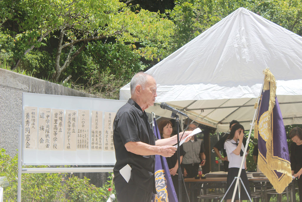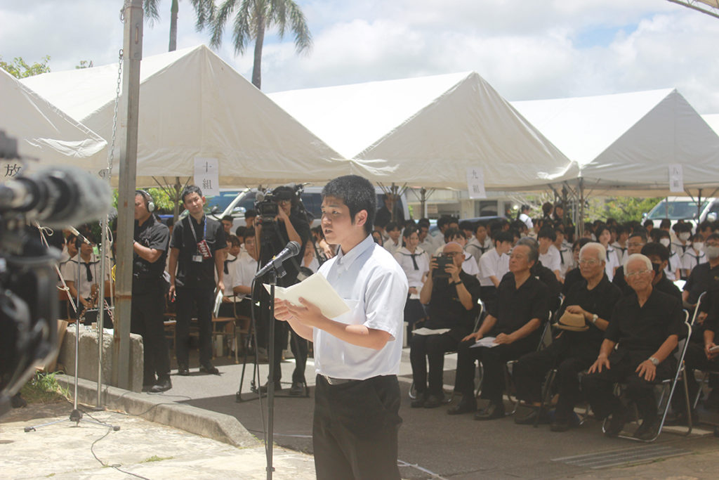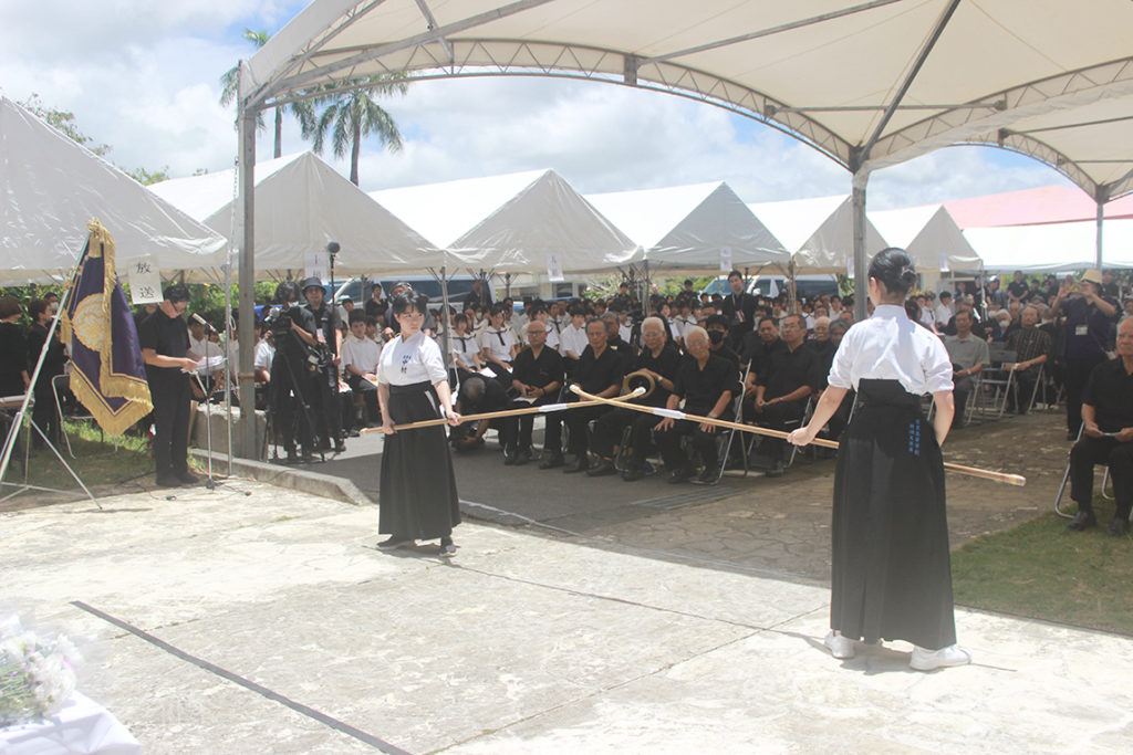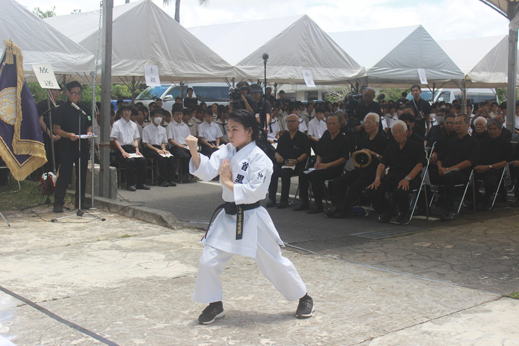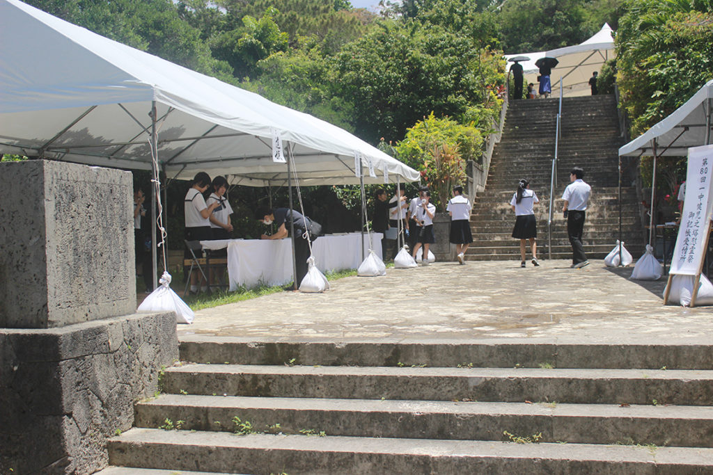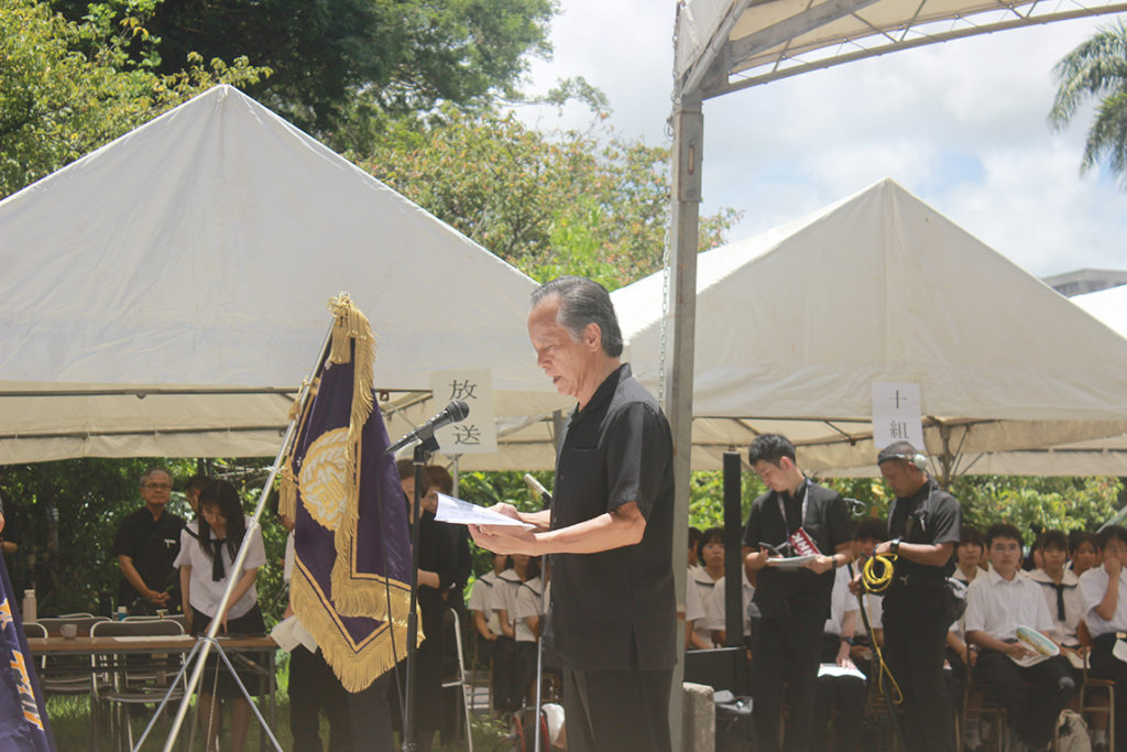 強い日差しが照り付ける中、遺族や一中生、同窓生、首里高校職員・生徒・PTAなど約730名が参列し、正午の時報にあわせて黙とうをささげ、恒久平和への誓いの言葉、なぎなた部・空手部の奉納演舞、献花を行い平和の誓いをあらたにしました。