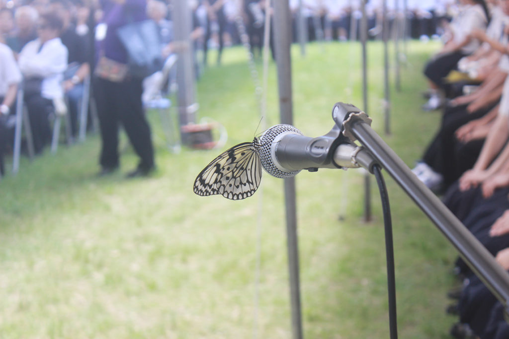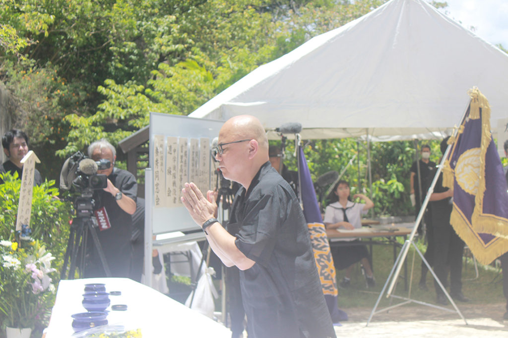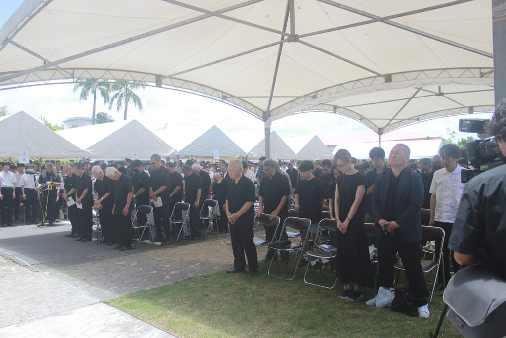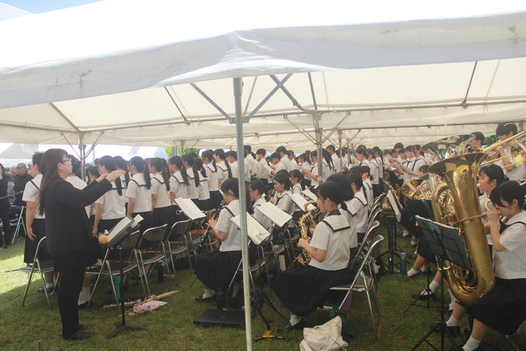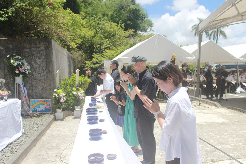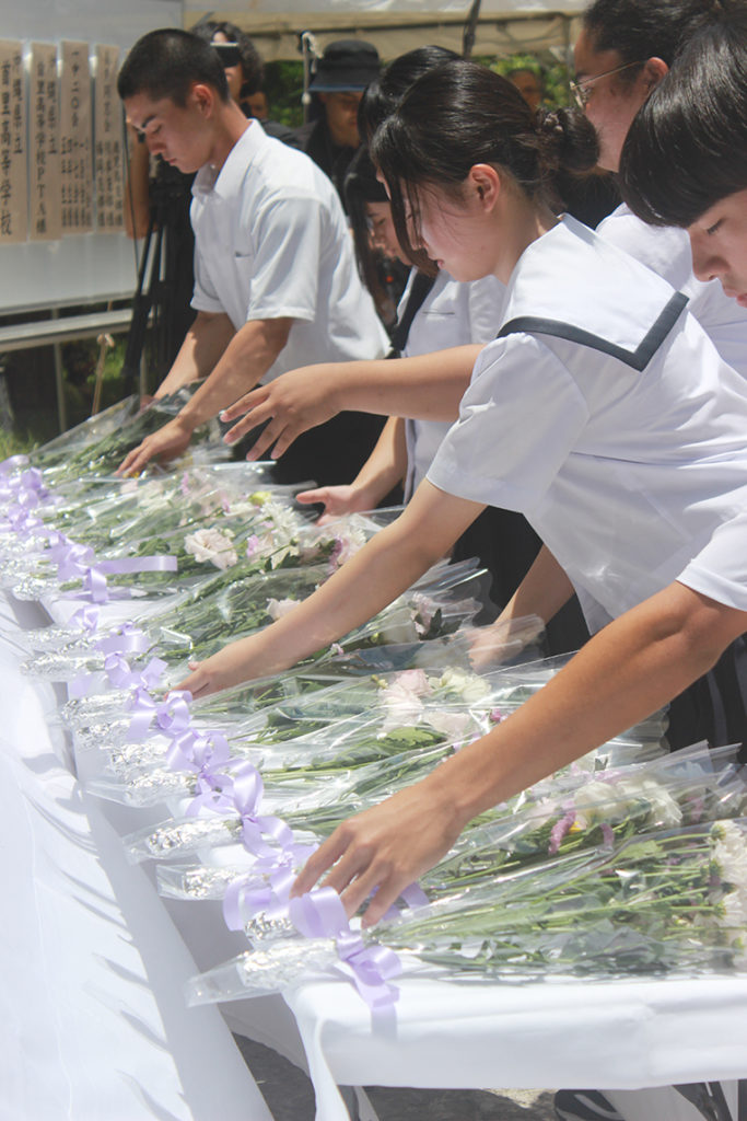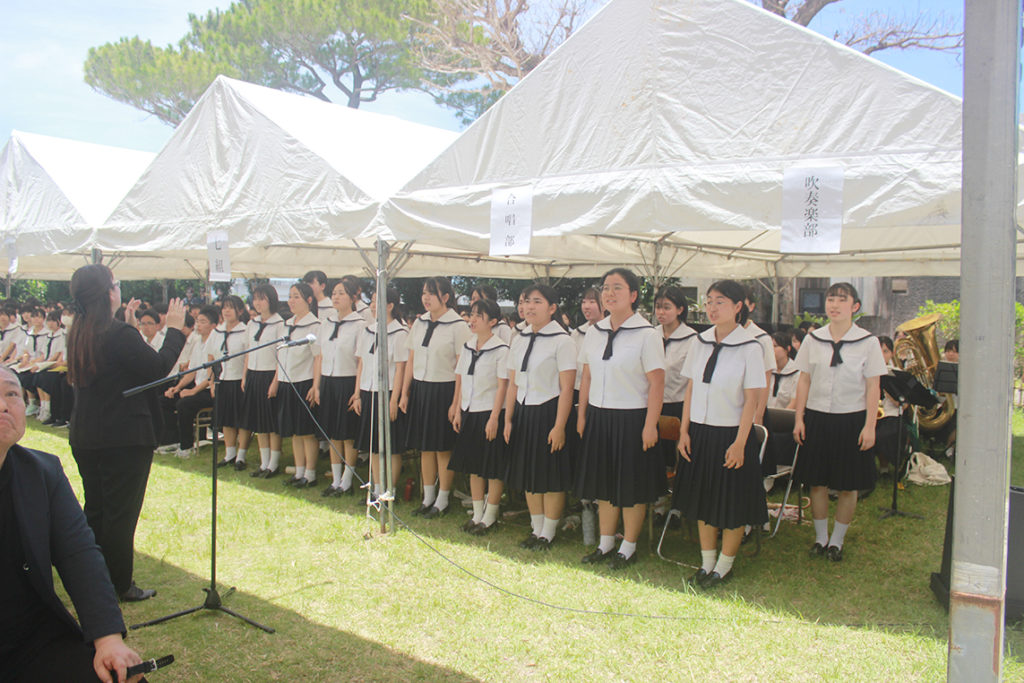 強い日差しが照り付ける中、遺族や一中生、同窓生、首里高校職員・生徒・PTAなど約730名が参列し、正午の時報にあわせて黙とうをささげ、恒久平和への誓いの言葉、なぎなた部・空手部の奉納演舞、献花を行い平和の誓いをあらたにしました。