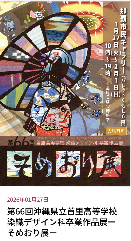 1月27日(火)からパレットくもじ6階にて、首里高等学校染織デザイン科卒業作品展「そめおり展」が開催中です。
